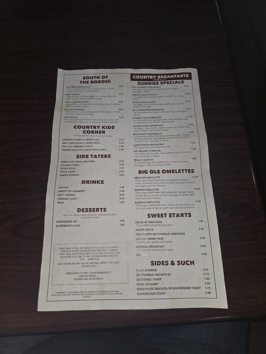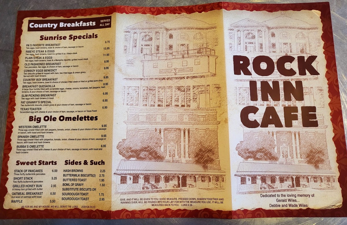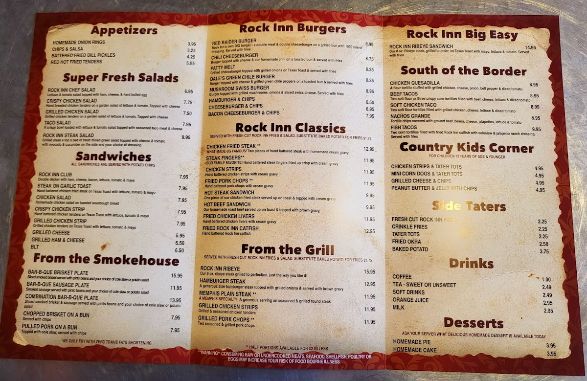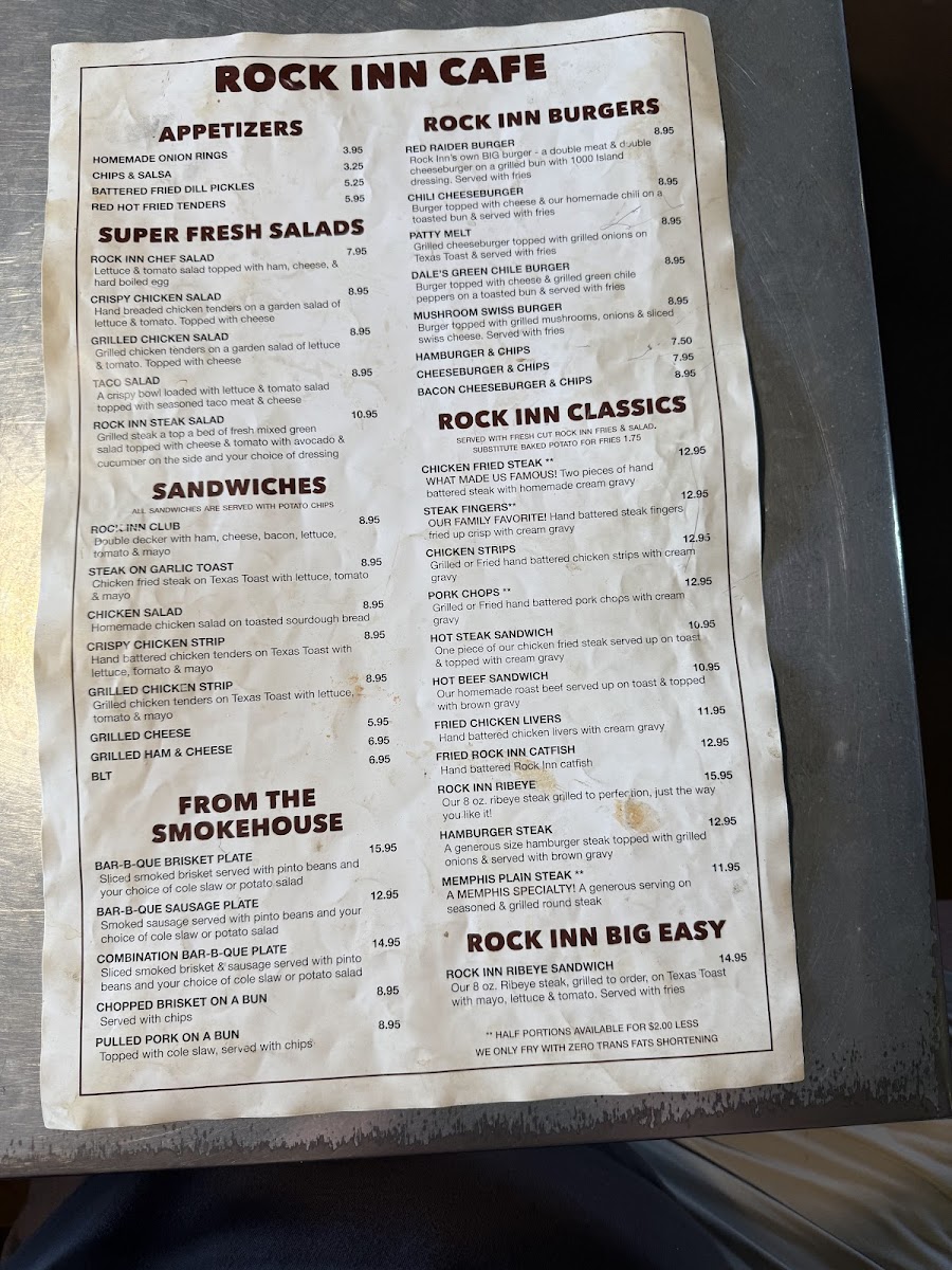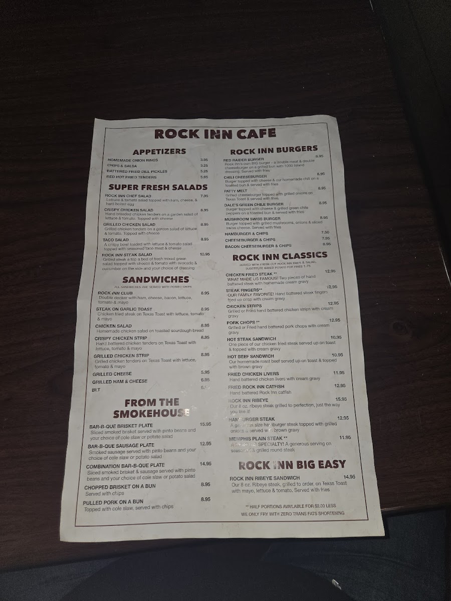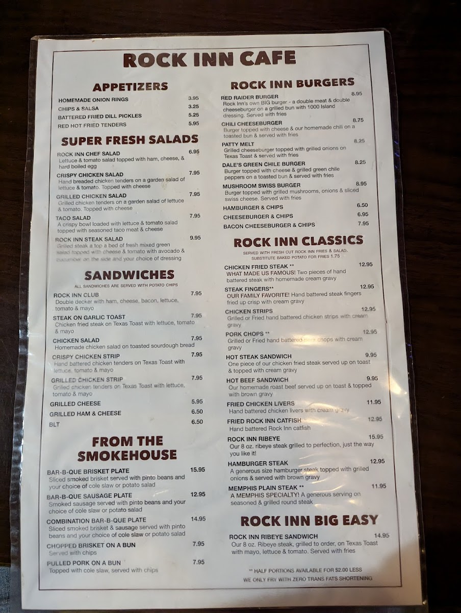 Welcome to Rock Inn Cafe, a hidden gem located in Memphis, Texas, known for its hearty, homemade dishes that promise to satisfy every craving. The menu features beloved Rock Inn Classics such as the famous Chicken Fried Steak and crispy Steak Fingers, both served with rich, homemade cream gravy. For something lighter, try the Super Fresh Salads, with options like the Crispy Chicken Salad topping fresh greens.